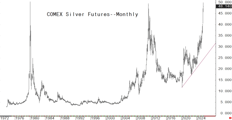 Xem biểu đồ tiếp diễn hàng tháng của các hợp đồng tương lai bạc trên sàn Comex gần đây cho thấy diễn biến giá vào tháng 1 năm 1980 đã chứng kiến giá bạc đạt đỉnh cao nhất mọi thời đại là 50,36 đô la một ounce, dựa trên các hợp đồng tương lai gần. Phải mất hơn 30 năm để bạc phá vỡ mức cao kỷ lục năm 1980 – đạt được điều này vào năm 2011 khi giá hợp đồng tương lai gần đạt 49,52 đô la. Sau đó, phải mất 14 năm để bạc vượt qua mức cao năm 2011 theo hướng tăng, nhưng chỉ tăng 44 xu, khi các hợp đồng tương lai bạc gần đây trong tuần này đạt mức cao nhất là 49,965 đô la.